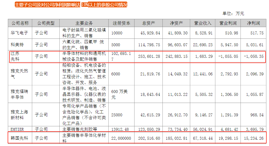 2016年12月,作为雅克科技子公司,江苏先科通过韩国子公司以11.79亿元现金,完成对UP Chemical 96.28%股权的收购。天眼查信息显示,2017年9月,大基金出现在江苏先科股东名单之中,2018年4月即退出,江苏先科成为雅克科技100%控股企业。