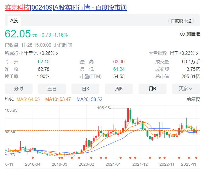 11月28日收盘,雅克科技股价跌1.16%,报62.05元/股,市值295亿元。