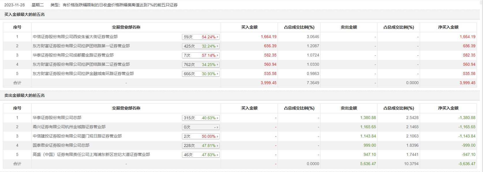 11月28日,龙版传媒今日跌停,龙虎榜数据显示,上榜营业部席位全天成交9635.92万元,占当日总成交金额比例为17.74%。其中,买入金额为3999.45万元,卖出金额为5636.47万元,合计净卖出1637.02万元。