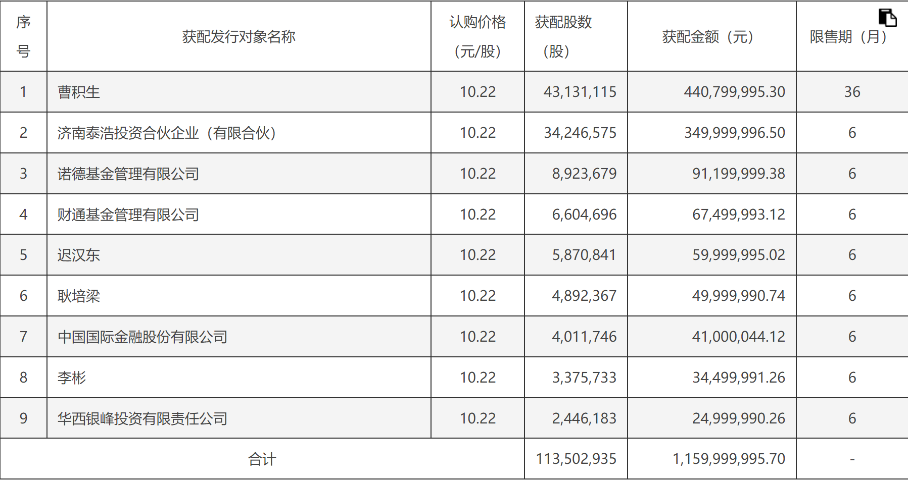 益生股份11月29日公告,本次非公开发行1.13亿股公司股份,发行价10.22元/股,募集资金11.6亿元,控股股东曹积生、诺德基金等9名对象获配。