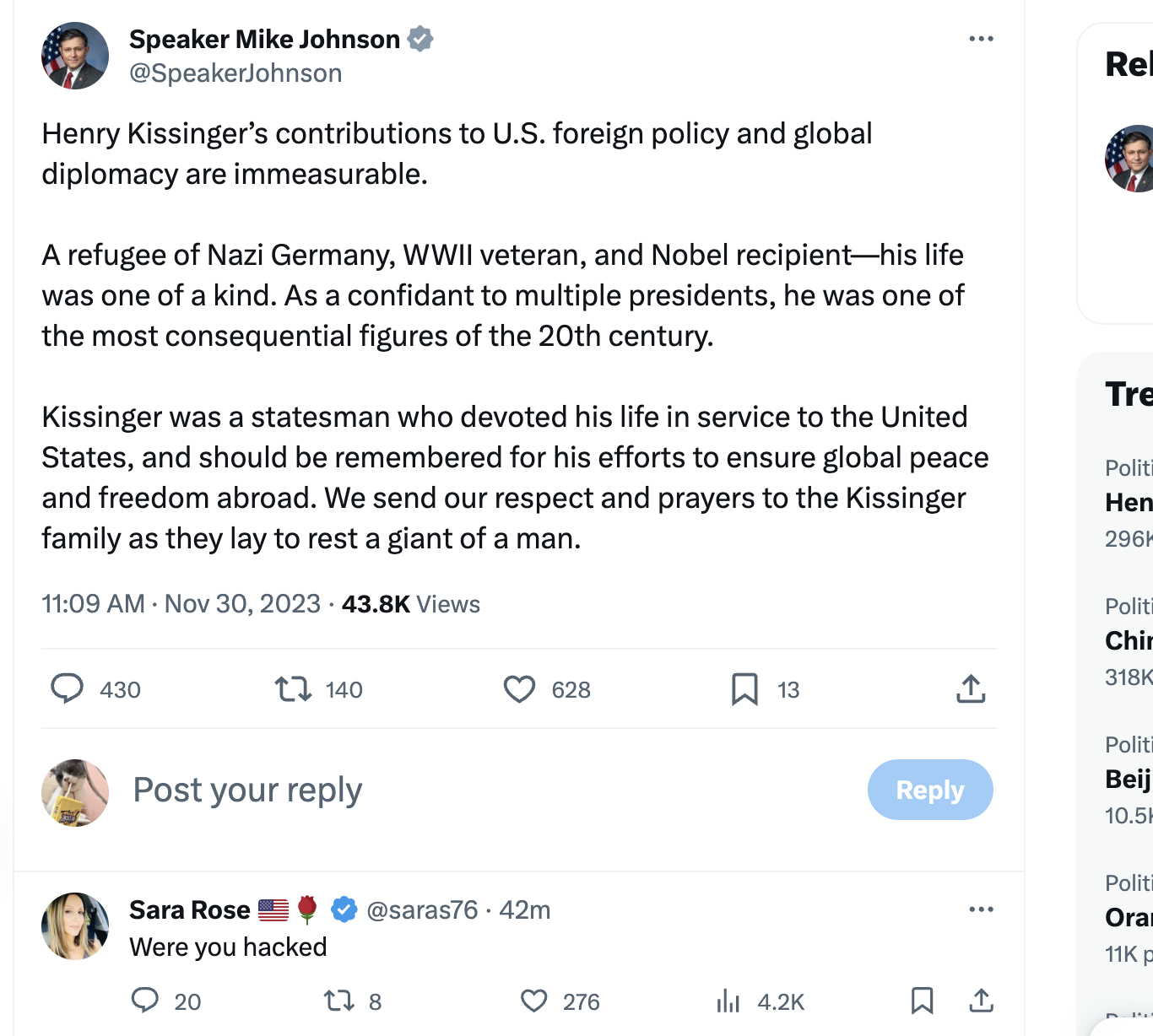 “世界失去了一位孜孜不倦的和平倡导者。美国失去了一位国家利益的杰出捍卫者。我失去了一位珍贵的朋友和导师。”他说,在七年多的时间内里,基辛格改变了美国在世界上的角色,在宪法危机中团结了国家,撰写了富有远见的著作,为世界领导人提供了咨询,还丰富了国家和国际话语。