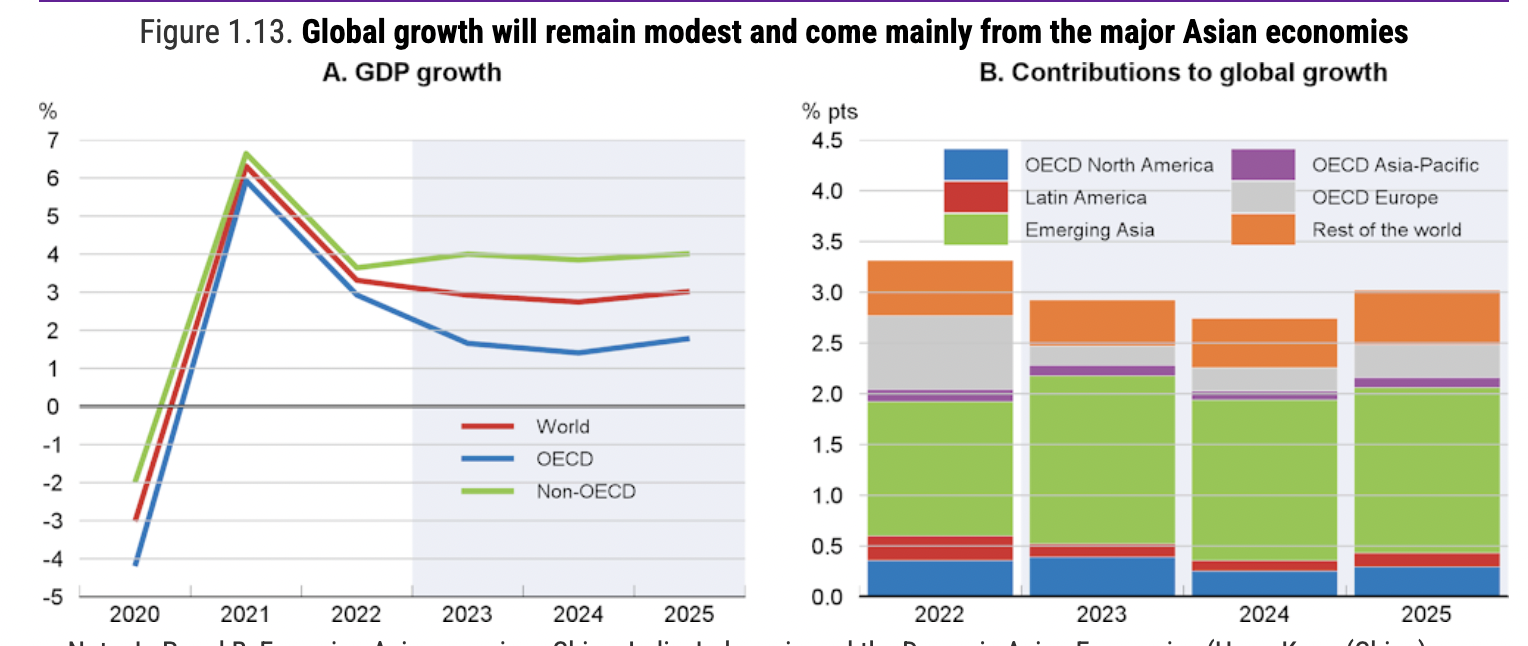 11月29日,经济合作与发展组织 (OECD) 更新了全球经济展望报告,对未来两年的全球趋势和前景进行了分析。该组织预计明后年全球经济继续面临通胀和低增长前景的挑战,但经济展现了韧性,增长放缓是温和的,预计能够避免硬着陆。