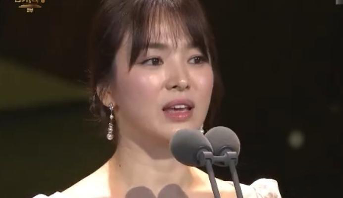 获奖后,宋慧乔发表感言:“和喜欢的人一起领奖,真的很开心。”而宋仲基适时回应搭档的赞美,“真的非常美丽又大方”。