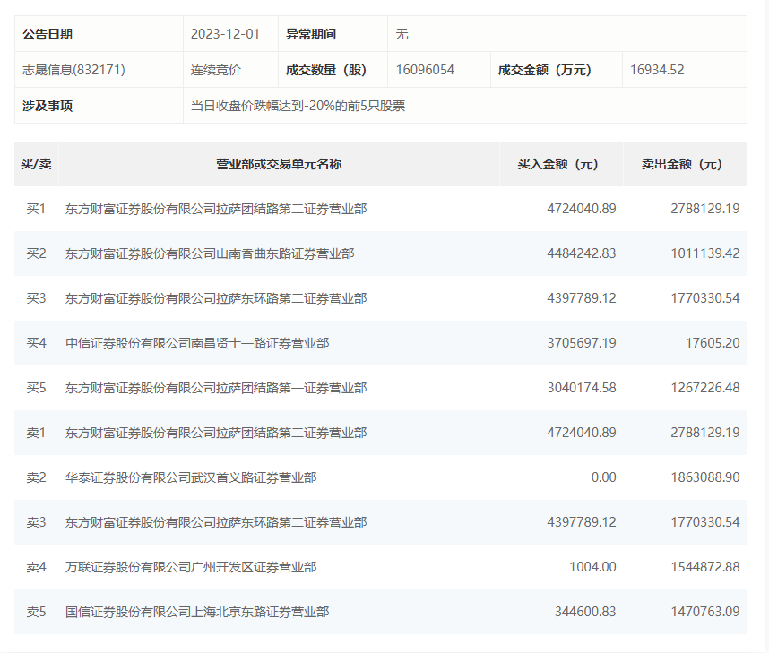 12月1日,志晟信息今日跌26.9%,全天换手率达23.97%,振幅达14.75%。龙虎榜数据显示,营业部席位合计净买入896.44万元。其中,东方财富证券拉萨团结路第二证券营业部、华泰证券武汉首义路证券营业部分别卖出278.81万元、186.31万元;东方财富证券拉萨团结路第二证券营业部、东方财富证券山南香曲东路证券营业部分别买入472.40万元、448.42万元。