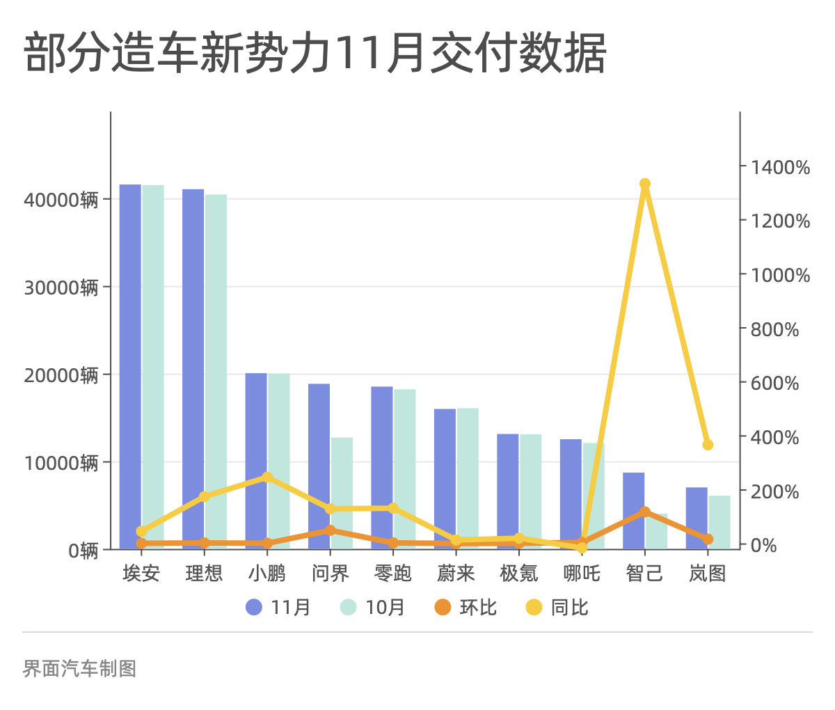 在界面新闻统计的10家新势力品牌中,有8家销量过万,其中6家超过1.5万辆,埃安和理想更是以超4万的成绩占据第一梯队。智己和岚图两个品牌虽然仍在千辆级的水平,但也各自创造了最好的月销量成绩。