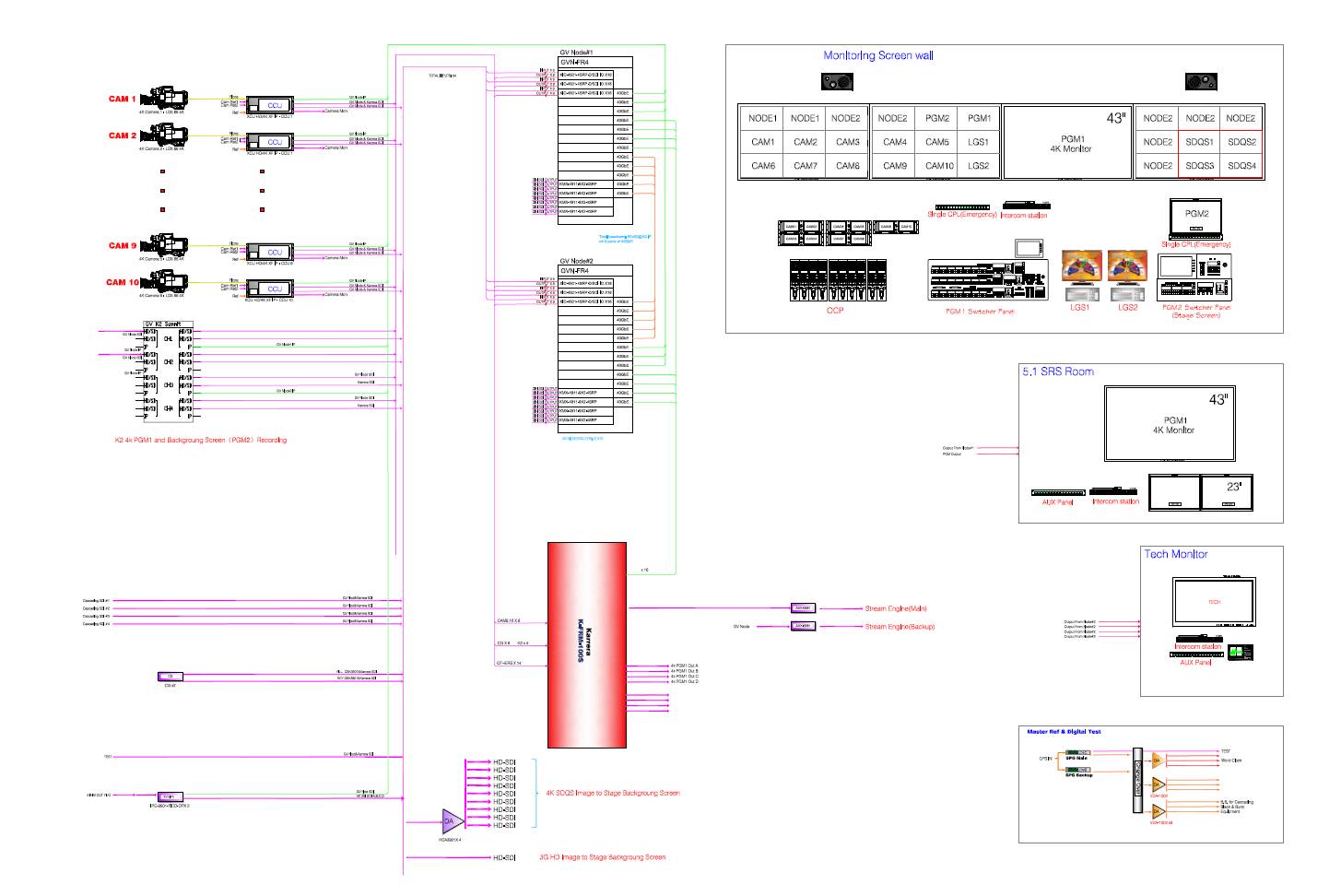 整个视频系统制作为4K IP 全流程制作、切换、录制、监看,HD直播传输的方式。共采用15个机位,其中4个机位是特种设备,以外来信号的形式进入系统;系统使用的3M/E 4K切换台,480GB带宽处理的GVNode作为核心处理设备;录制采用K2录制主备PGM,Clean 4K信号,EVS录制4通道 4K单机位信号,shogun录制所有单机位1080P格式信号;最终的直播信号经过下变换成HD格式直播传输。