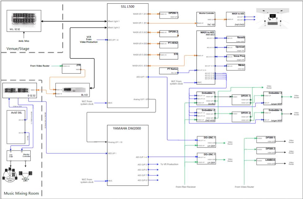 最终确立的音频系统构架以48KHz采样率、24Bit深度为标准,以AES10标准 MADI 协议及 AES3标准 AES/EBU协议方式传输为主。数字化多通道传输构架令复杂的制作系统及OB流程得到最大程度的简化。远端接口箱以多模光纤MADI 协议嵌套Black Light接口进行传输,确保安全传输的同时极大简化长距离线缆敷设数量,有效降低安全威胁及系统搭建难度。