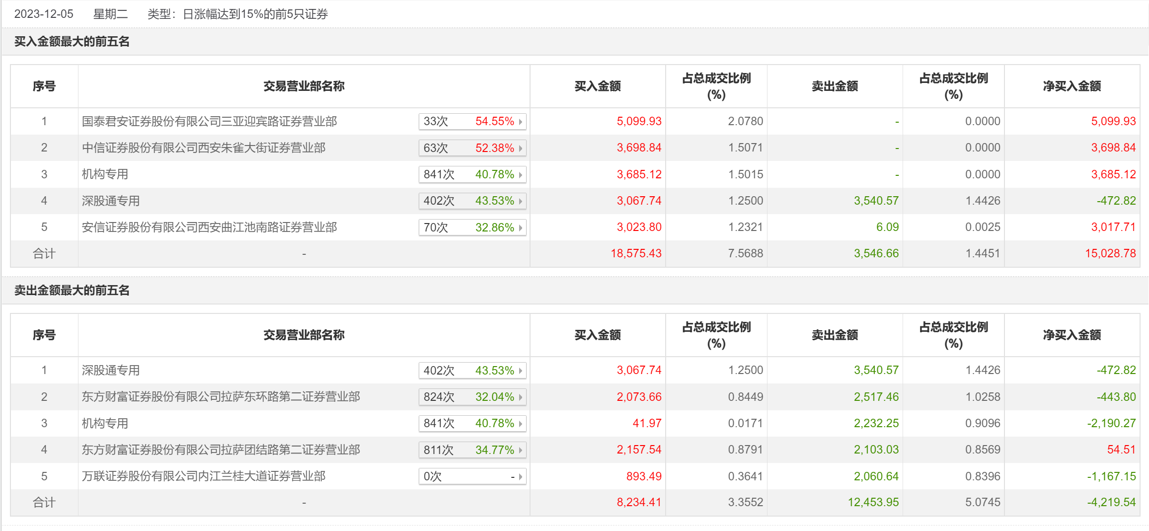 具体来看,机构买入3727.09万元,卖出2232.25万元,合计净买入1494.84万元。此外,知名游资现身龙虎榜,国泰君安证券三亚迎宾路证券营业部、方新侠(中信证券西安朱雀大街证券营业部)分别买入5099.93万元、3698.84万元;深股通专用、东方财富证券拉萨东环路第二证券营业部分别卖出3540.57万元、2517.46万元。