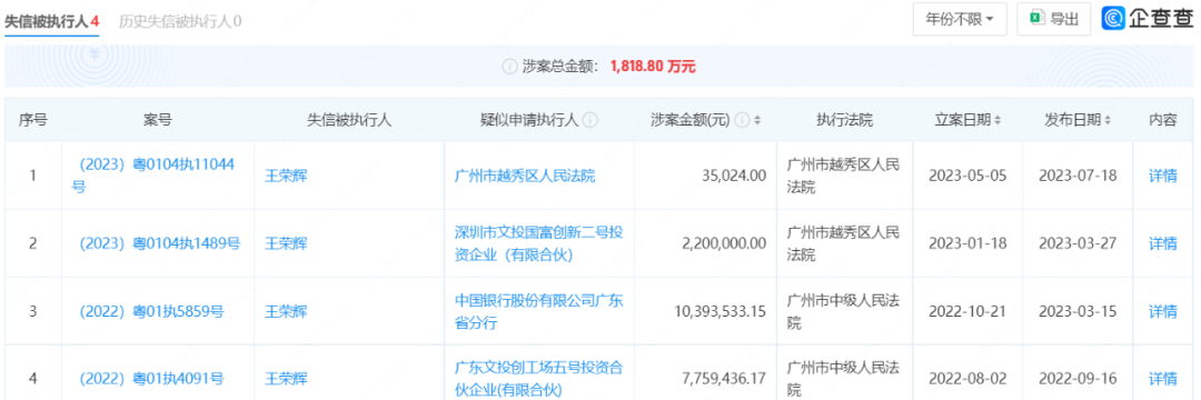 就这样,王荣辉的12载托育机构梦碎。 根据企查查信息,王荣辉4次被列为失信被执行人,总计涉案金额1818.8万元,其中3次与“文投系”有关,涉案金额约996万元。据王荣辉透露,“文投系”有4只基金投资了纽诺教育。其中,冻结她本人微信、支付宝、医保卡、申请拘留的投资方,都来自“文投国富”。