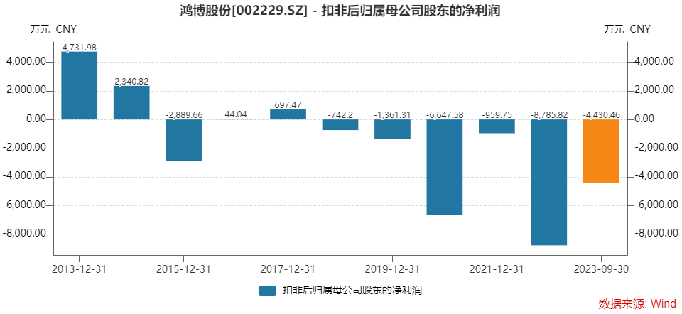 多年以来,鸿博股份业绩处于亏损状态。自2018年至2023年前三季度,公司扣非后归母净利润在持续亏损,累积亏损2.29亿元。近两年归母净利润也出现亏损,今年前三季度亏损3,229.12万元。