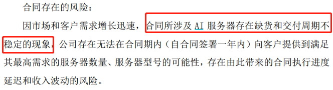 此外还需要注意的是交货风险。在7月7日的关注函回复中,鸿博股份称,因市场和客户需求增长迅速,合同所涉及AI服务器存在缺货和交付周期不稳定的现象,公司存在无法在合同期内(自合同签署一年内)向客户提供到满足其最高需求的服务器数量、服务器型号的可能性。