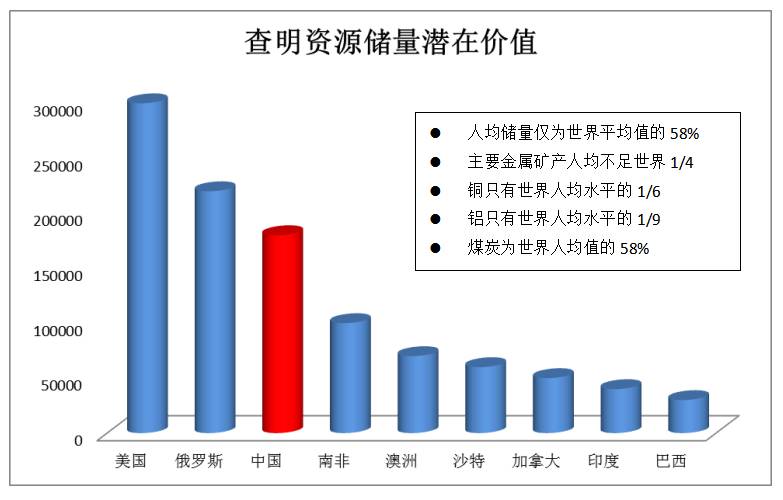 中国查明资源储量潜在价值位列世界第三,仅次于俄罗斯和美国,但人均储量仅为世界平均值得58%,铜铝等金属甚至不足世界人均20%。