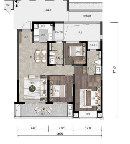 119的户型设计和109一致,只是主卧的面宽从3.3米变成了3.5米,生活舒适度又上了一个台阶。