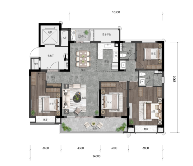 可以看到,149户型拥有四房两厅两卫,四开间设计。户型方正,南北完全通透, 近15米的南向开间,采光效果好;南北双阳台的设计,在市面上还是比较少见的。南侧阳台8米4的宽度,主打休闲功能。北侧工作阳台,实用性强。南北双阳台,景观效果好不说,通风效果也是极佳的。南向主卧套房设计,约3.8米主卧开间,独立全明卫生间,步入式衣帽间,且南向大面飘窗赠送,居住舒适感强。同时,次卧也拥有充足的收纳空间。