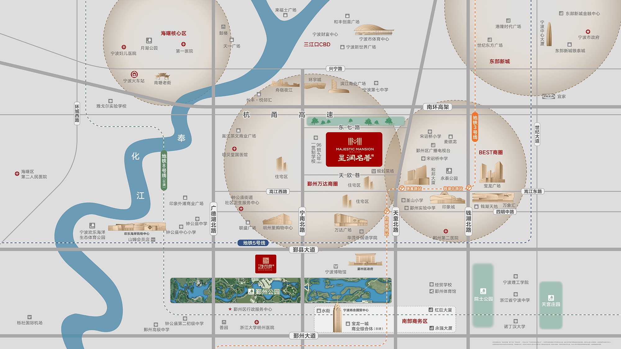 区位而言,地段的核心性前面已经重点说明。除了商业配套外,星润名著在别的方面的配套都堪称顶级。教育方面,一公里范围内就是堇山小学和宋诏桥中学,均鄞州区数一数二的学校。医疗方面,鄞州二院(三级乙等)、明州医院(民营综合)、李惠利医疗中心(三级甲等)等,都在项目三公里范围之内。交通来说,横向嵩江路、四明路是东西方向的大动脉,纵向宁南路、天童路,贯穿宁波各区域,北侧环城南路高架连接机场、动车站,十分便捷,去往东部新城或者上高速也仅需10分钟车程。生态方面,项目往南直线距离约2公里就是被称为“城市绿肺”的鄞州湿地公园...