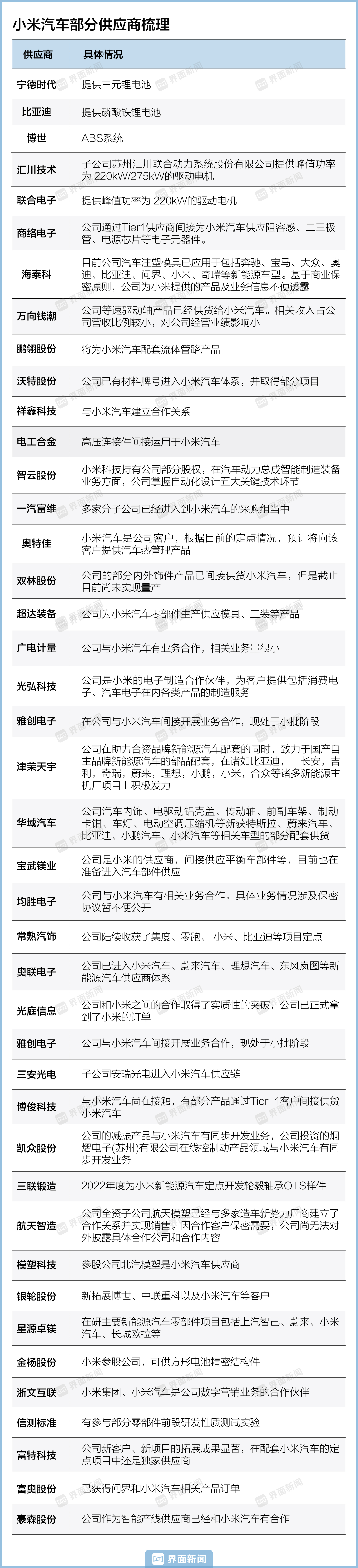 随着首款车型上市时间的临近,小米汽车相关供应商也相继浮出水面。界面新闻根据公开信息梳理发现,已经有超过40余家产业链企业成为小米汽车的合作方。