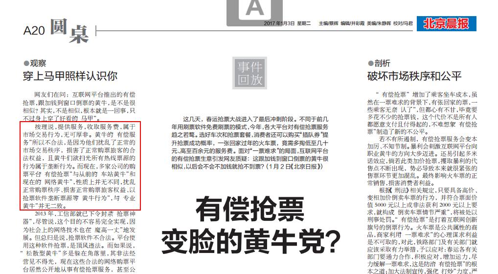 今天的北京晨报发表文章《有偿抢票 变脸的黄牛党?》,指出“多家公司的购票平台‘有偿抢票’与从前的车站黄牛和现在的‘网络黄牛’,性质上并无不同,扰乱正常购票秩序,损害正常购票旅客权益,以抢票软件垄断票源等‘黄牛行为’,与‘专业黄牛’并无二致。”。