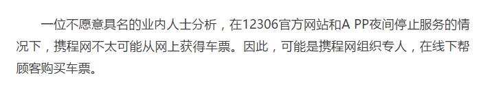 同时,携程的24小时VIP抢票说明中特别提到夜间只支持线下出票,南方都市报的文章《自称加价30能八成得手 网络有偿抢票=“黄牛”?》中对于携程夜间出票有过推测(见下图),而速途网在勾选24小时VIP抢票、VIP专人抢票后抢票成功率也提升了超过10%。在同时选择VIP专人抢票与24小时VIP抢票后,服务费为96元(包括:66元+25元配送费+5元铁路客票代购费)。