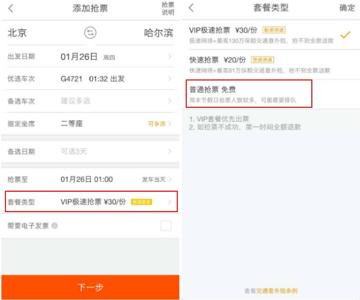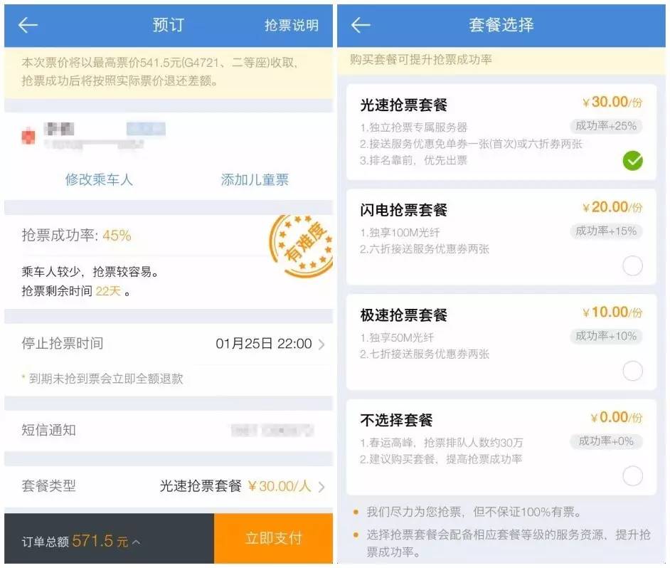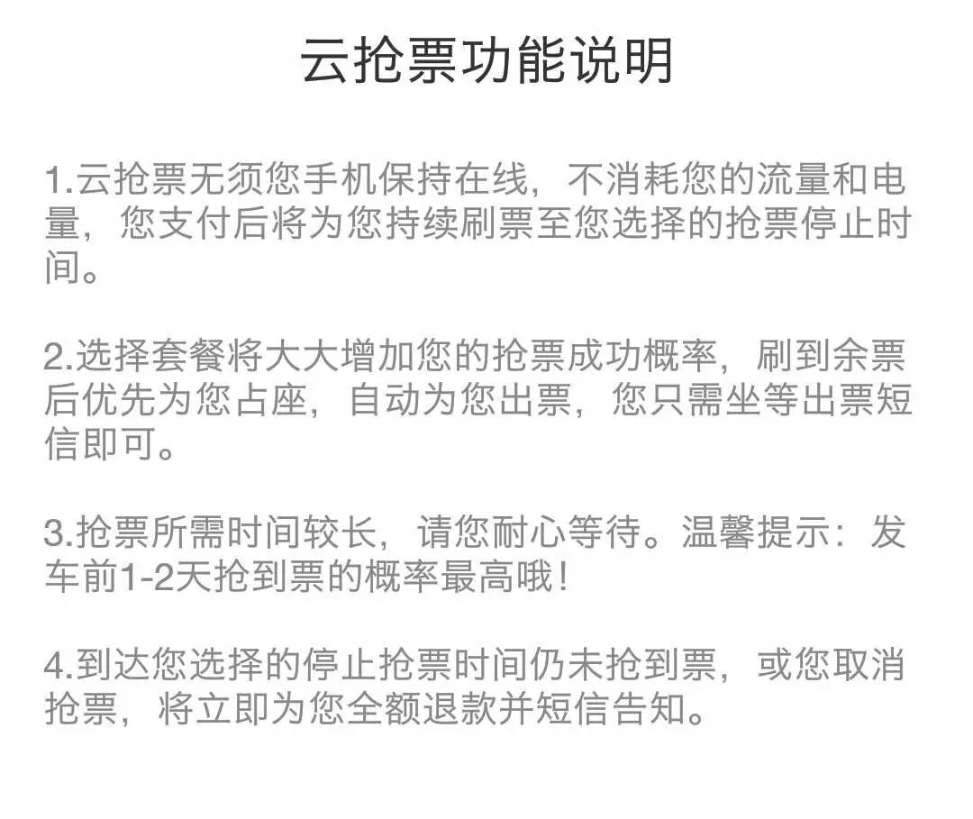 同时,去哪儿的抢票功能说明中特意提到了“选择套餐将大大增加您的抢票成功概率”,还提示用户发车前1-2天抢到票的概率最高。