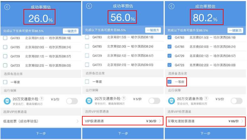 在“全不勾选”的情况下,智行预估的成功率为26%,当选择了一种30元的加价模式后,成功率提高了30%,而当“全部勾选”后,成功率达到了80.2%。