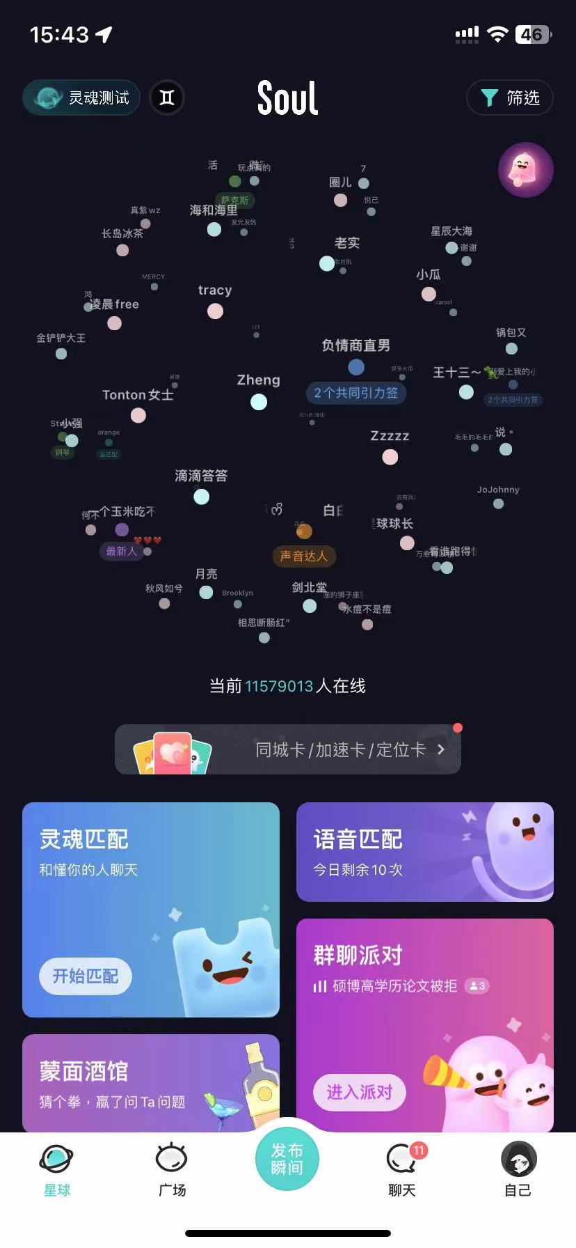 在私信里被问多了“多高多重”“做什么工作” 后,@曲奇 逃来了Soul。无论是在明确“拒绝查户口式聊天”的灵魂匹配;还是只知晓对方有哪些引力签的“蒙面酒馆”中,@曲奇 感到了一种少有的放松。不管是“民谣”“旅行”还是“坚持夜跑”“零食测评家”,纵使互相看不到社会身份,也不妨碍就着共同话题展开漫无边际的聊天。