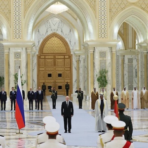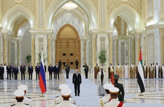 在本次中东之行的第一站阿联酋,普京受到高规格接待。在阿布扎比降落后,全套骑兵护卫队护航普京前往总统府,在那里迎接他的是21响礼炮,阿联酋军用飞机则拖着俄罗斯国旗颜色的烟雾从上空飞过。