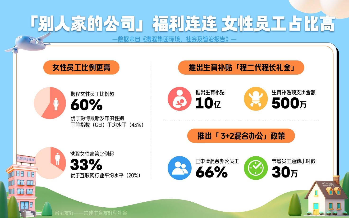 携程也致力于建立性别平等、包容多元的工作环境,吸引了大量女性员工的青睐。目前携程女性员工比例超60%,优于彭博最新发布的性别平等指数(GEI)平均水平(43%);女性高管占比超33%,优于互联网行业平均水平(20%)。10亿生育补贴实施,预支付金额超500万元;同时,携程成为国内首家推出了“混合办公政策”的企业,目前已有三分之二的员工享受该福利累计节省30万小时通勤时间。