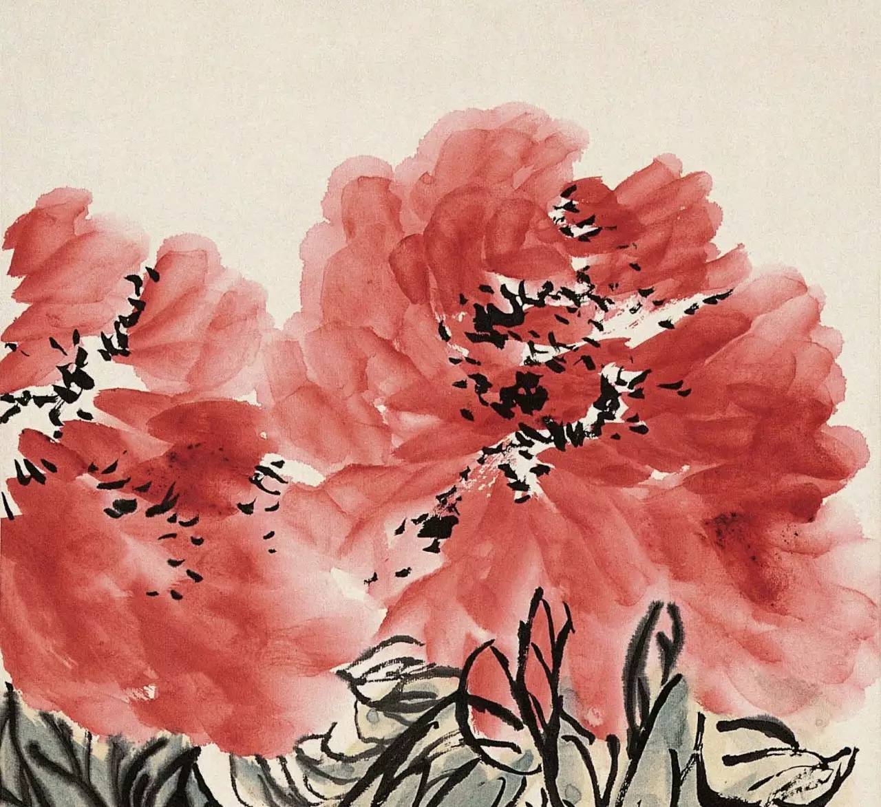 我们读白石老人的牡丹,不难发现一个有趣的现象:那就是他画叶子的走向与其他画家不同。大多数画家画牡丹,叶子都是向上仰起的,这样画整体显得精神,而白石老人的牡丹叶子却是下垂的。这是为什么呢?我们仔细研究作品以后就会发现,其实白石老人画的都是雨后的牡丹。不管是画花朵还是叶子,老人都用了水分很大的画笔,画花朵时他让水分晕出,而叶子湿气淋漓含水下垂,老人极力表现出的是小雨初霁,春花更艳的意境。画雨后花朵难度很大,白石老人表现地得非常成功。