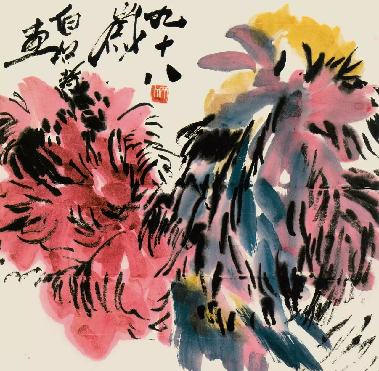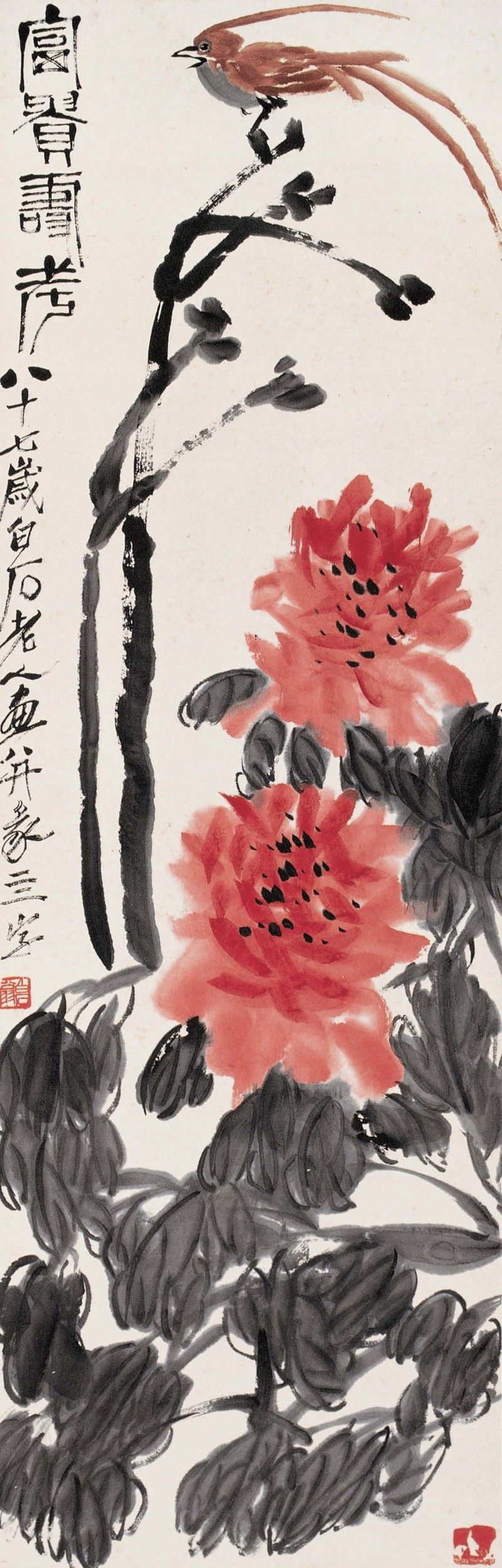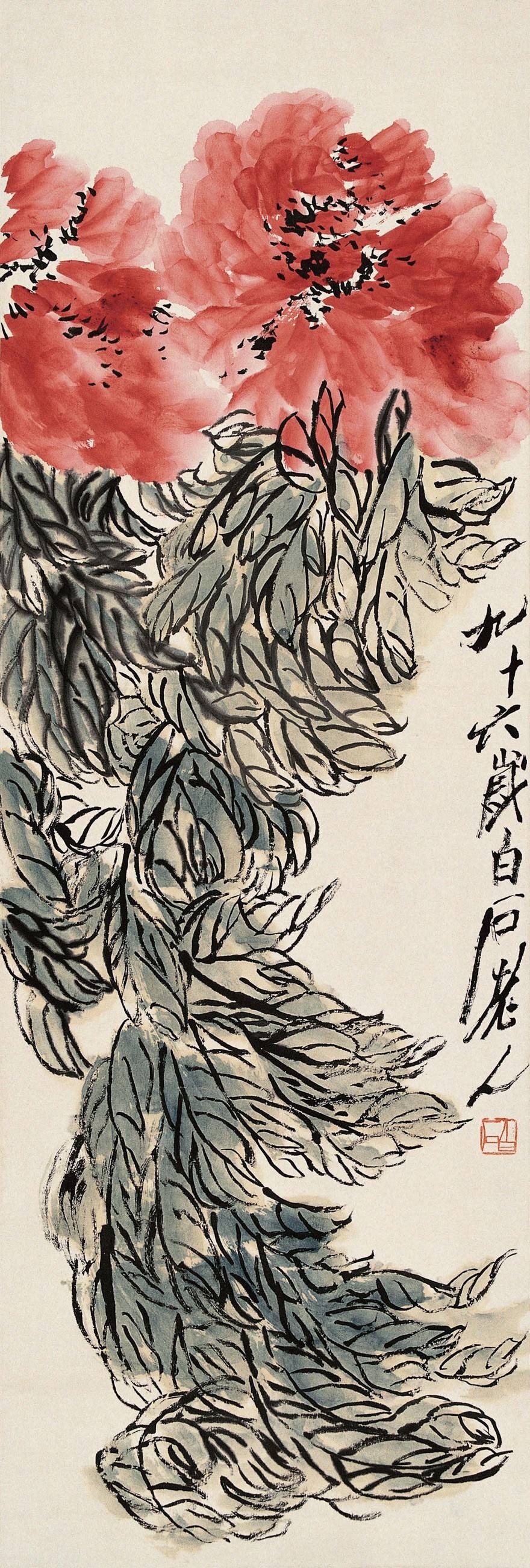 白石老人90 岁以后画牡丹,往往用极重的洋红,让人更觉美艳绝伦。特别是老人在生命的最后一两年还在不停地挥笔画牡丹,此时的老人举手投足皆已超纵,他怎么写都合理,随便画都生辉,他笔下的牡丹早已浑然一体,得意忘形。一幅幅承载着老人富贵平安美好愿望的花神图,已然融大仁之爱,得大和之美,超越了自然和生命,完全进入了一派自由天成的大化之境。