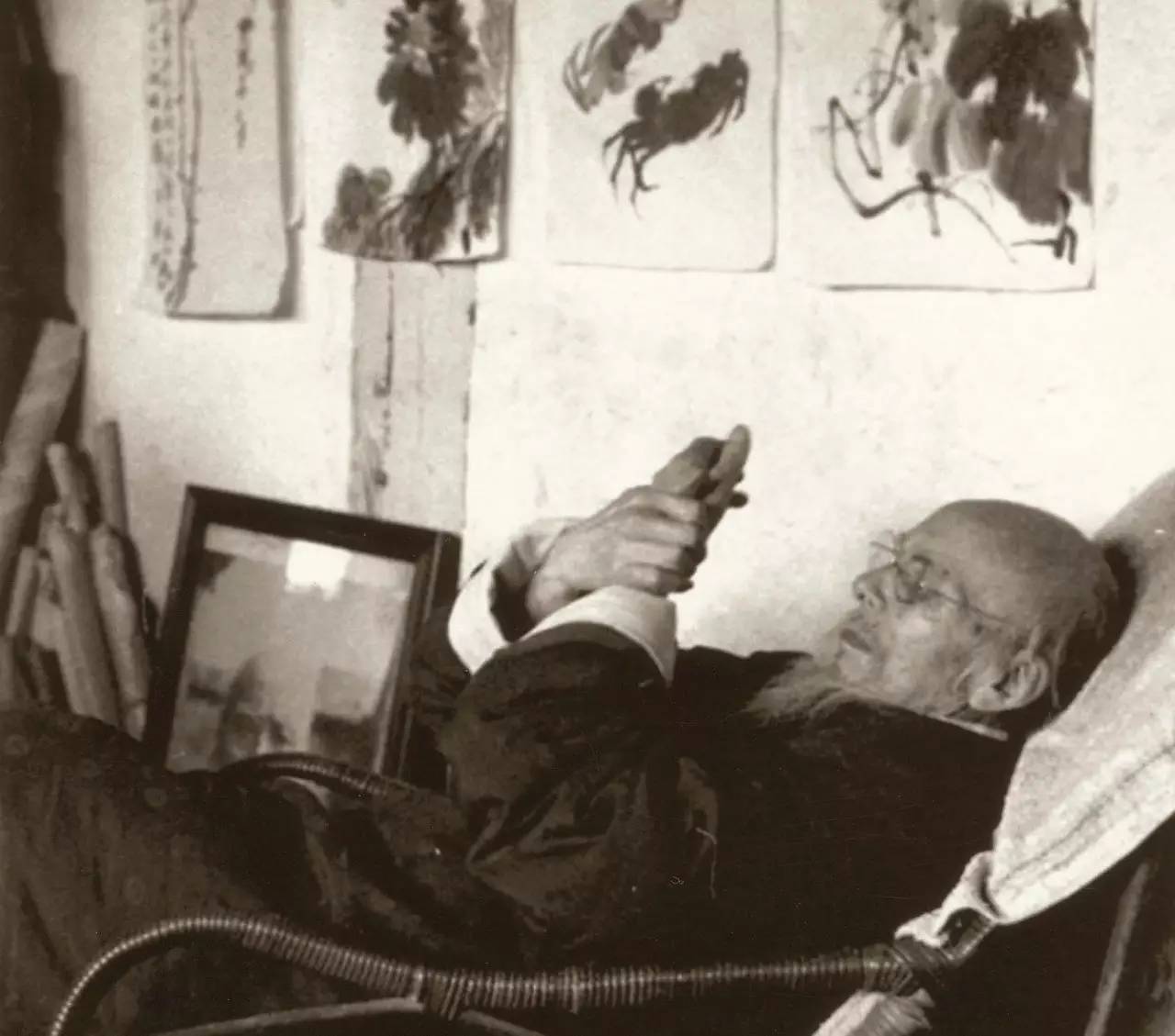 作画间隙的齐白石