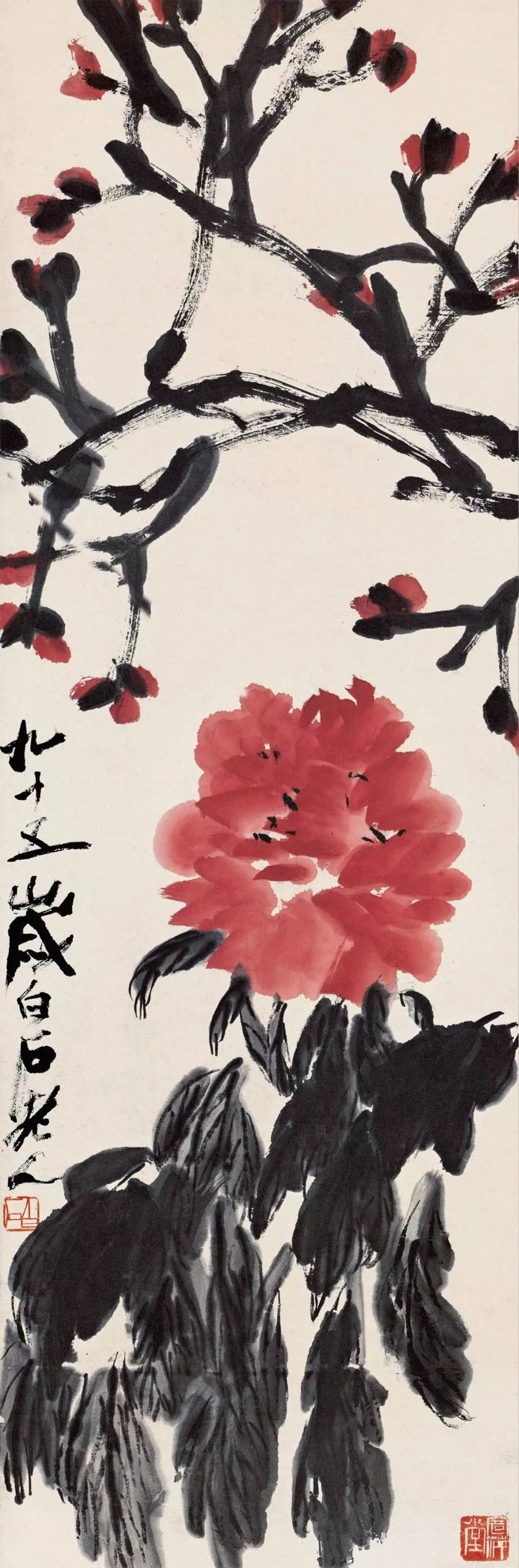 白石老人一生喜画牡丹,可谓“姹紫嫣红开遍”。据可靠史料记载,老人去世前画的最后一幅画也是牡丹。但齐白石的牡丹与众不同,他笔下的牡丹不是宫墙下回廊旁雍容富贵的牡丹,而是生长在田间地头,农家宅院寻常百姓时常能看得到的牡丹。这些牡丹带着齐白石童年生活的记忆,散发着浓郁的乡野气息,虽粗枝大叶,却平易真挚,朴实而欢快,丝毫没有矫揉造作之感。