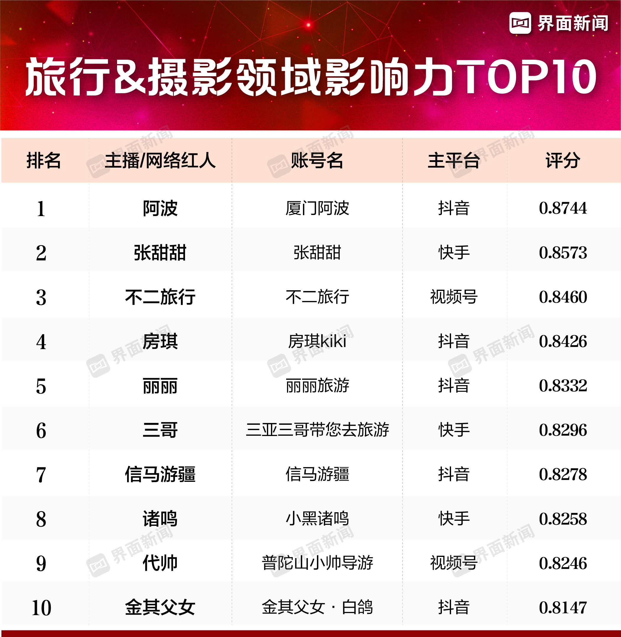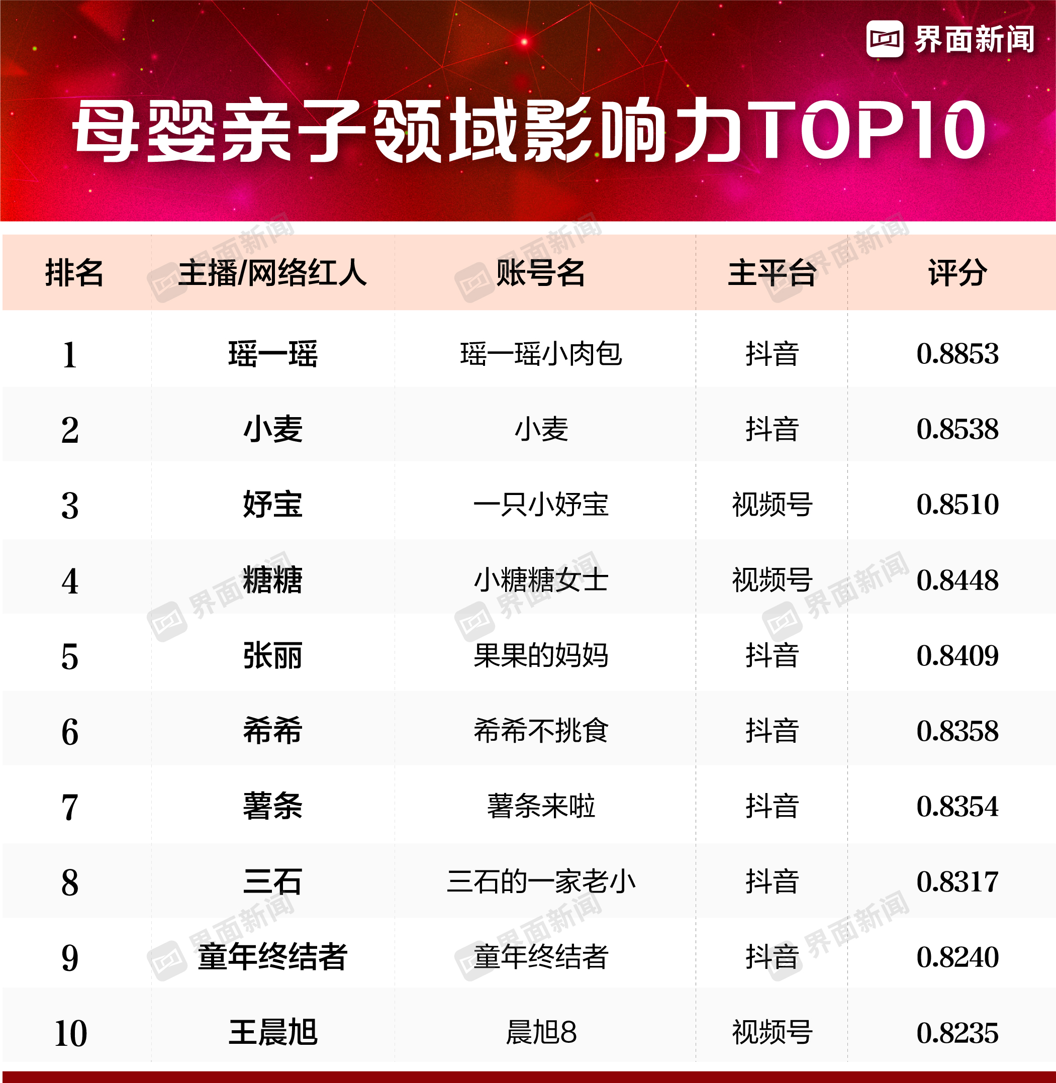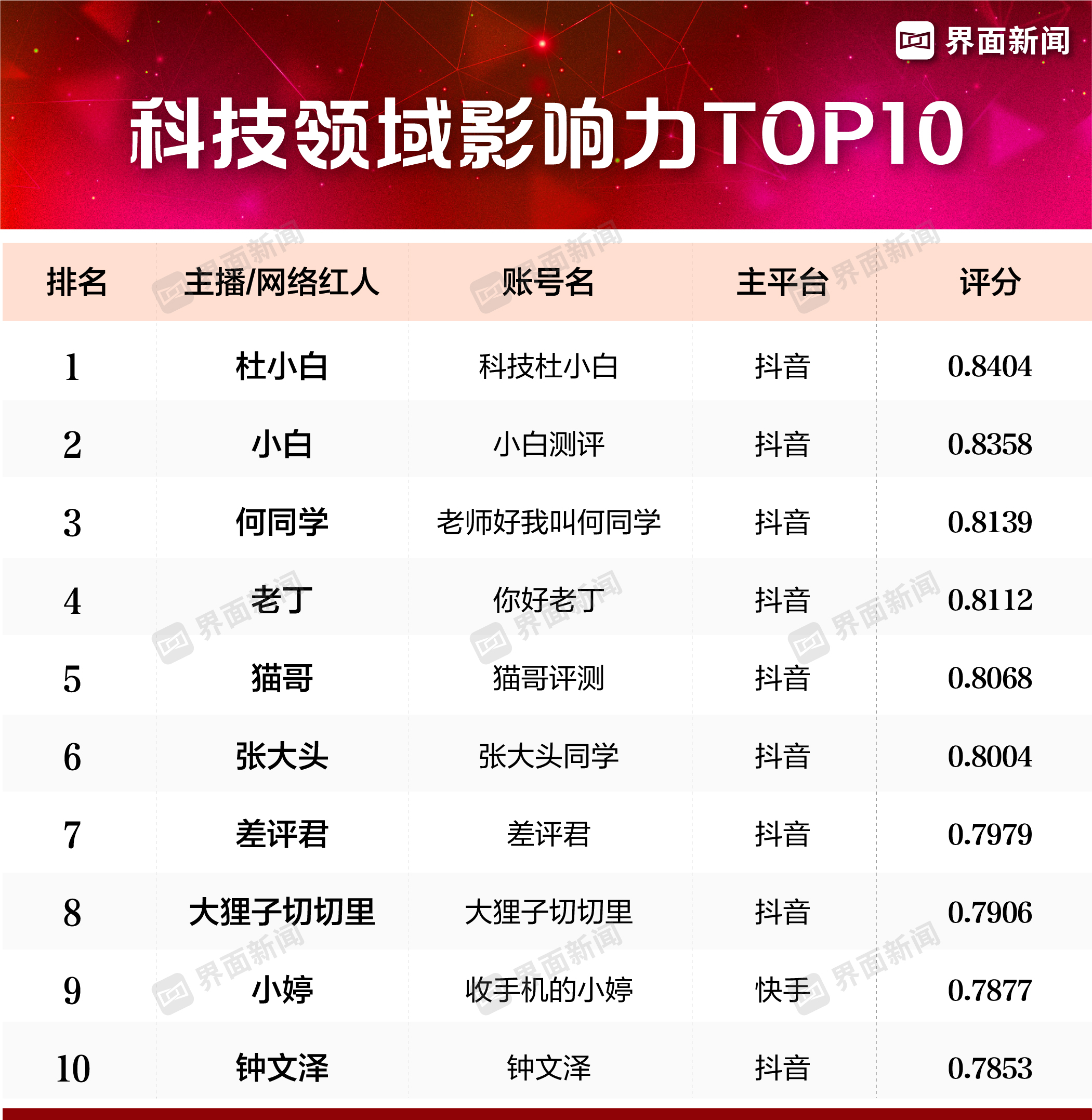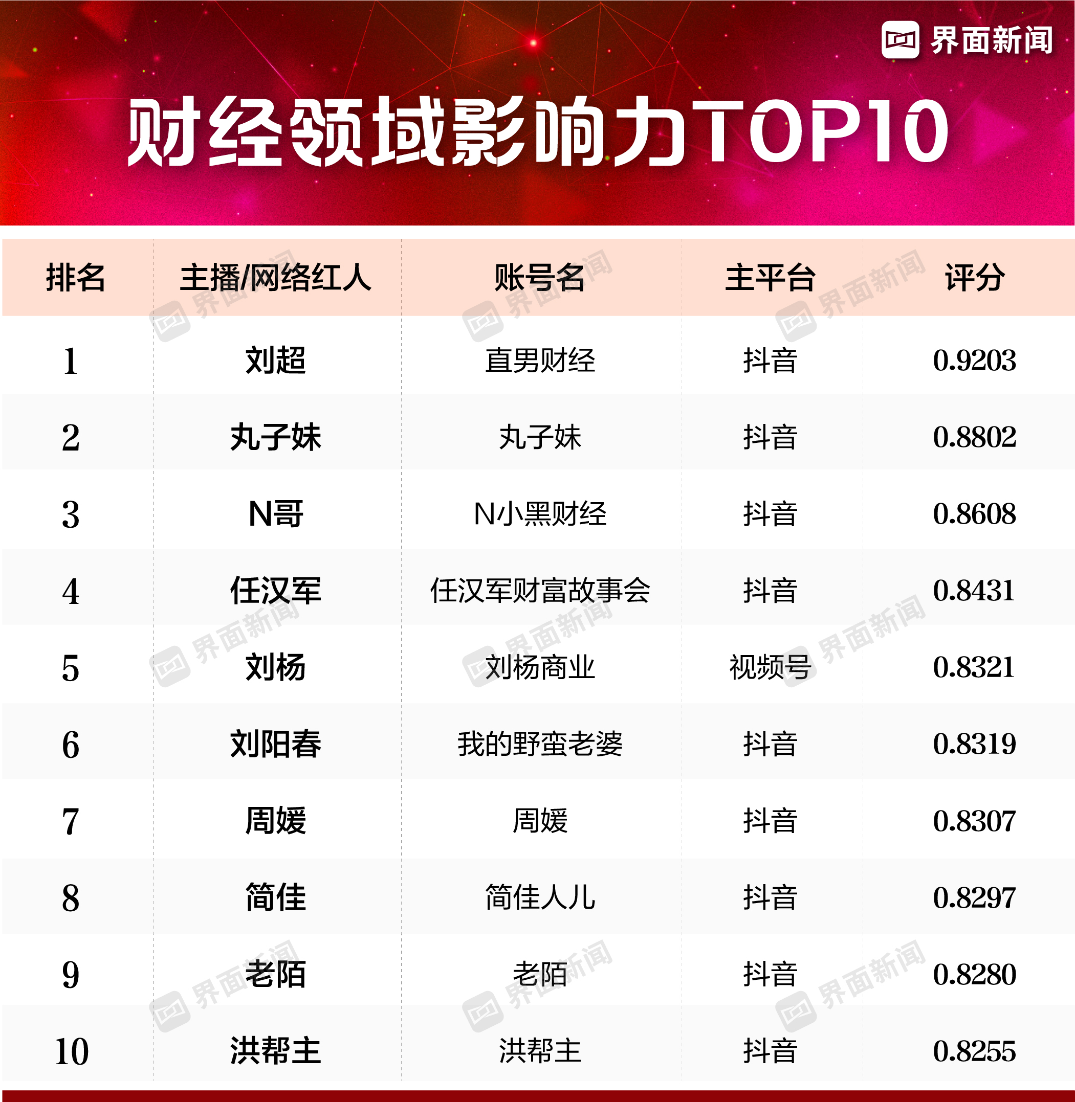 界面新闻2023年度影响力红主播榜单,关注各平台上持续输出优质内容输出、且存在巨大影响力的主播/网络红人。该评选旨在发现主播/网络红人影响力趋势,助力短视频行业健康发展。界面新闻2023年度影响力红主播榜单评选覆盖抖音、快手、视频号、小红书、哔哩哔哩等平台。界面新闻通过桌面调研、媒体推荐、专家审议等环节编制本榜单。