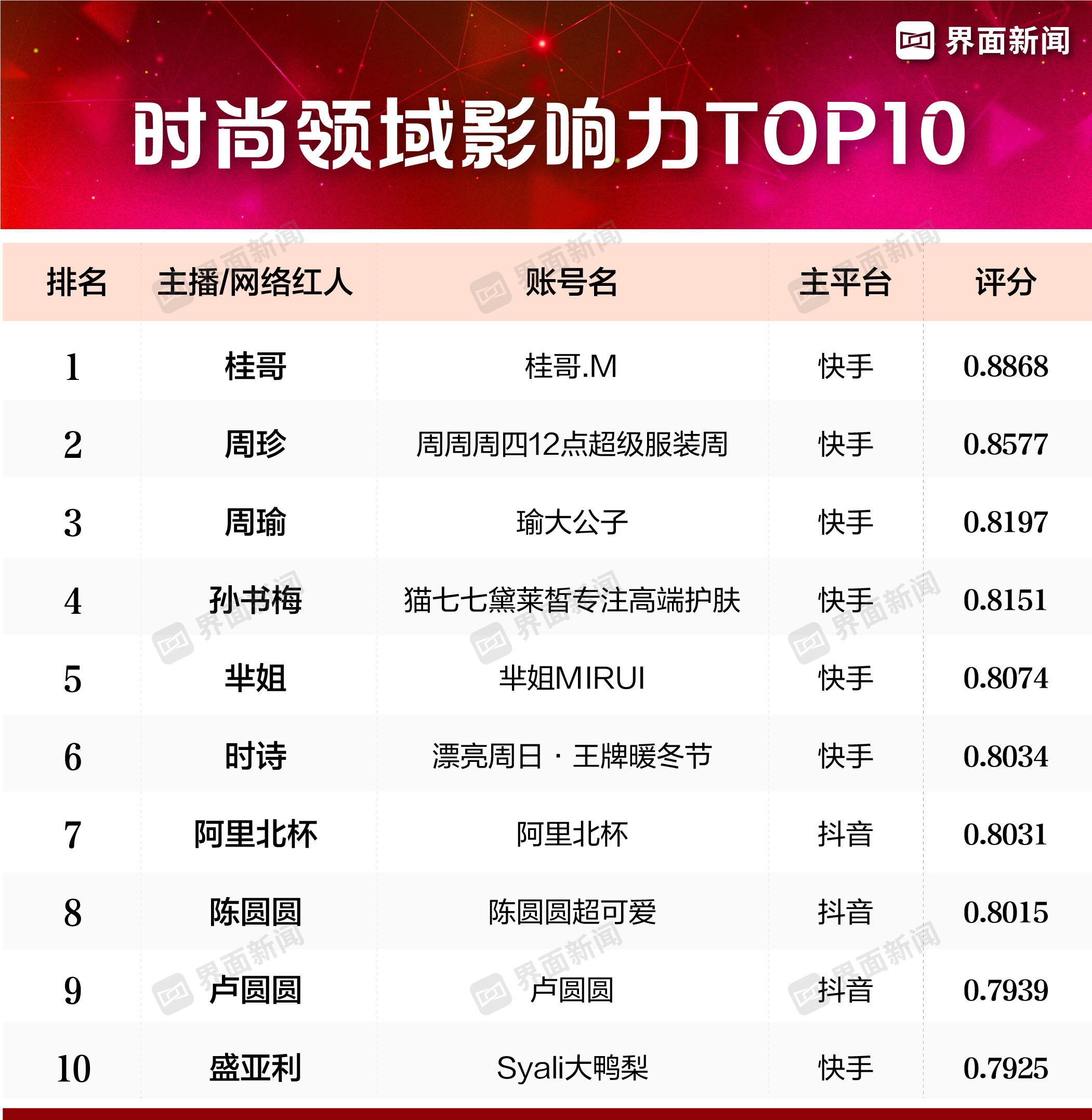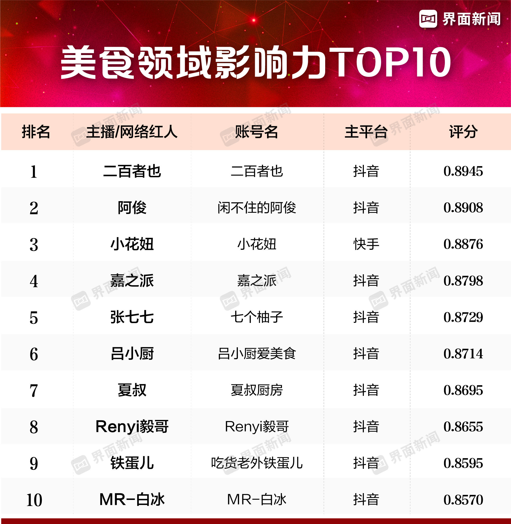 数据方法方面,各平台数据存在不一致的情况,我们通过模型进行了估算。界面新闻通过主播/网络红人的粉丝数、作品数、评论数及分享数等数据建立影响力模型。对于一位主播/网络红人拥有多个账户的情况,我们进行了数据合并计算;对于同一账户拥有多位核心主播/网络红人的情况,我们对账户数据进行了适当分拆。对各排名数据对数标准化之后进行了适当的加权计算,以加权计算后的评分为制作本排名的最终顺序。入驻多个平台的主播/网络红人,本排名仅列示了主要平台(或之一)。