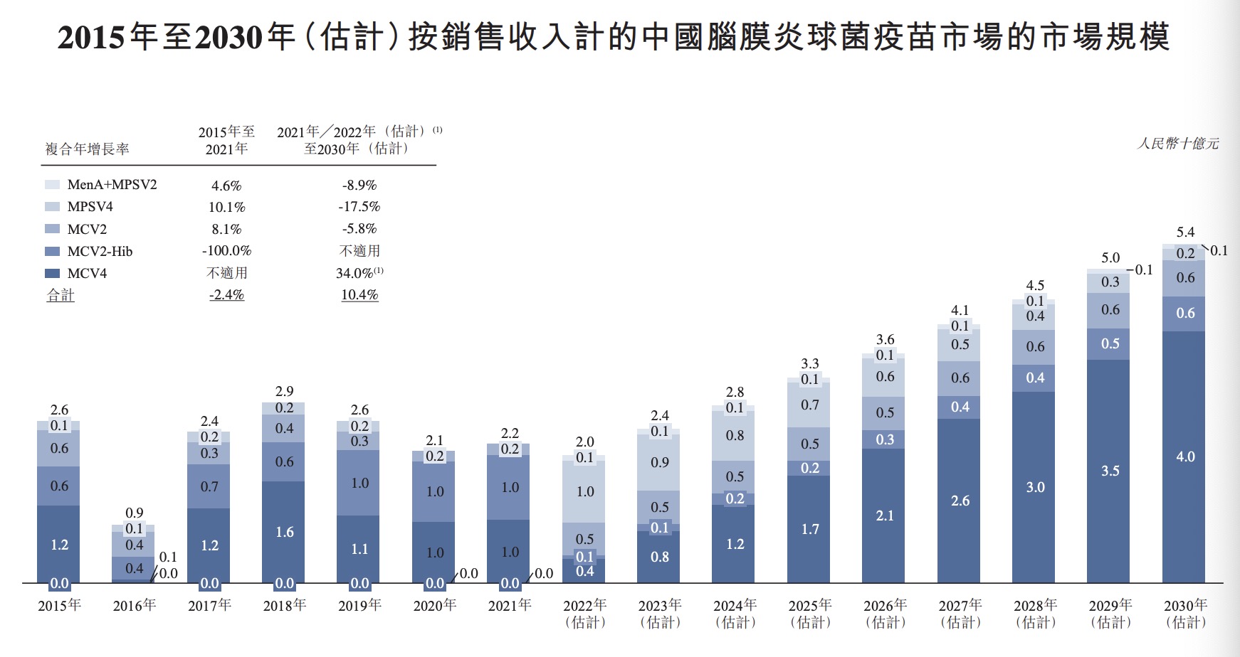 据艾美疫苗招股书中灼识咨询报告的数据,2021年中国脑炎膜球菌疫苗市场规模为22亿元,预计2030年增至54亿元,年复合增长率为10.4%。其中,市场增长主要是由于ACYW135结合疫苗推动。AC结合疫苗的市场规模基本无增长,预计将从2022年的5亿元增至6亿元。