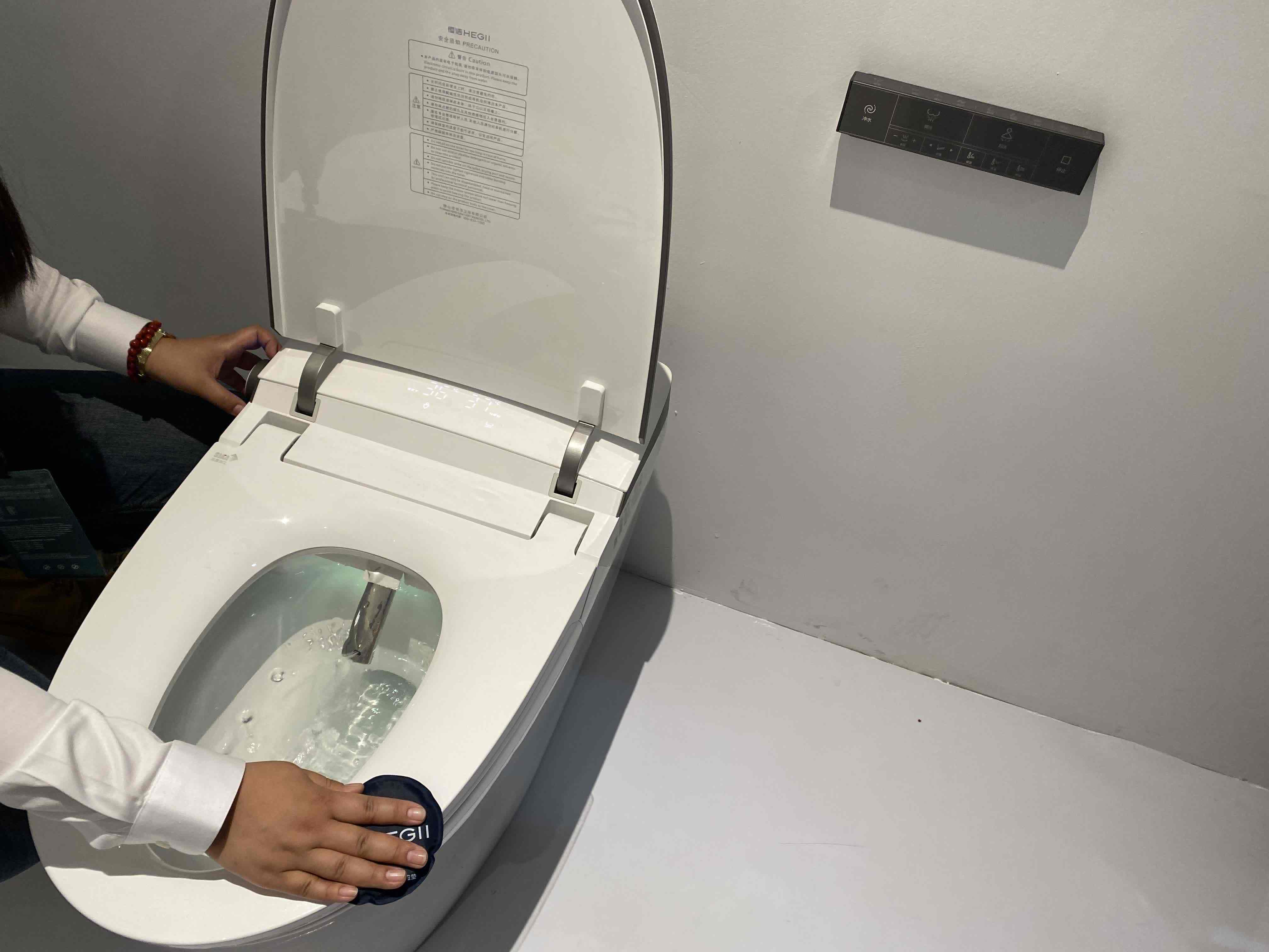 根据现场人员介绍,该马桶为今年新推R9智能一体机产品,重点功能为“随心洗”,即马桶内置水柱可以清洗如厕后的臀部,水柱喷洒有5种方式,水柱可移动、水温可调节。除此以外,该产品还内置将近10个传感器,照顾了男士小便靠近即可开盖的需求。