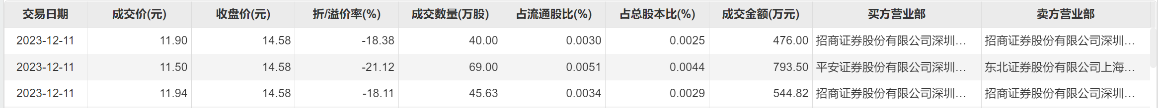 12月11日,东方财富今日大宗交易成交154.63万股,成交额1814.32万元,占当日总成交额的0.62%,成交均价11.73元,较市场收盘价折价19.55%,其中最高成交价11.94元,最低成交价11.5元。