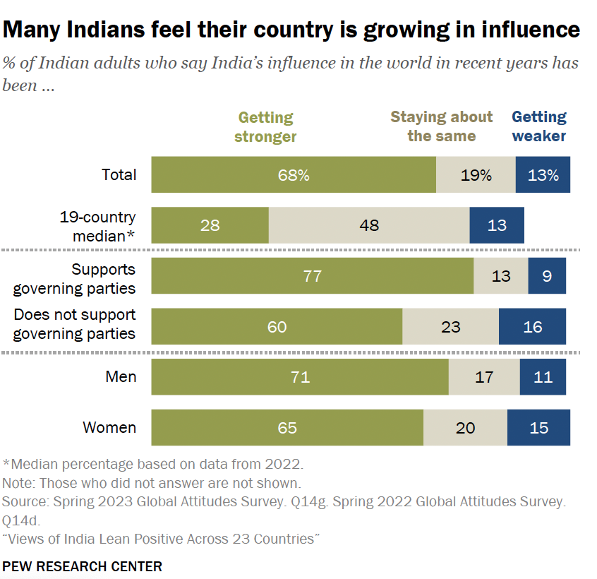 对于印度政府来说,印英自由贸易协定的成功达成无疑是迈向“世界第三”的重要一步。皮尤研究中心今年8月一项调查显示,大约有十分之七的印度人认为近年来印度在世界上的影响力不断增强,支持执政党的人中有77%的受访者赞同上述论断,不支持执政党的人中有60%的赞同上述论断。可见,如果能证明印度在世界舞台上的影响力不断增强,莫迪政府可能会收获更多选票。