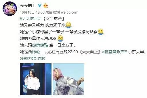 在《天天向上》官微预告中,用大量篇幅介绍了这位汪涵眼中的“非典型文艺少女”:“有一个女孩,她的肤色有点黑,她“看起来”文静乖巧,她的性格其实很乖张,她唱的歌,歌词都非常有意思。恩,你们大概知道我说的是谁了。”