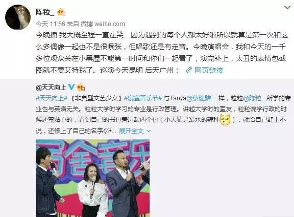 “今晚播,我大概全程一直在笑…因为遇到的每个人都太好啦所以就算是第一次和这么多偶像一起也不是很紧张,但唱歌还是有走音。今晚演唱会,我和今天的一千多位观众关在小黑屋不能第一时间和你们一起看了,演完补上,太丑的表情包截图就不要艾特我了。”