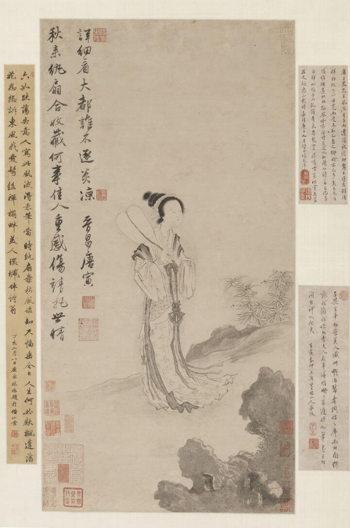 《秋风纨扇图轴》画的是西汉班婕妤的文学典故,据传班婕妤隐退长信宫后,在秋日里看到被弃置的纨扇,触景生情,作《怨歌行》以自哀。凌利中介绍,不平衡的构图给人一种飘摇之感,这幅画是唐伯虎的自我写照,他经历了人生的波折坎坷之后有了人生的思考,所以利用汉代的班婕妤典故表达自己的失意。