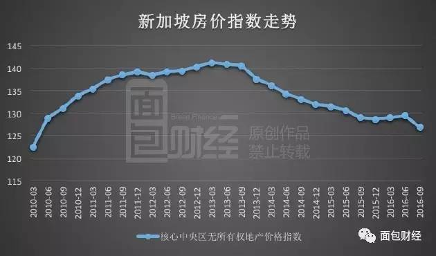 据统计,2016年第三季度,新加坡核心中央区房价指数为126.90;截至目前,新加坡房价已连续3年下跌,与2013年一季度时的141.20相比,跌幅高达10.12%。下图为面包财经根据新加坡城市发展局数据绘制的新加坡房价指数走势: