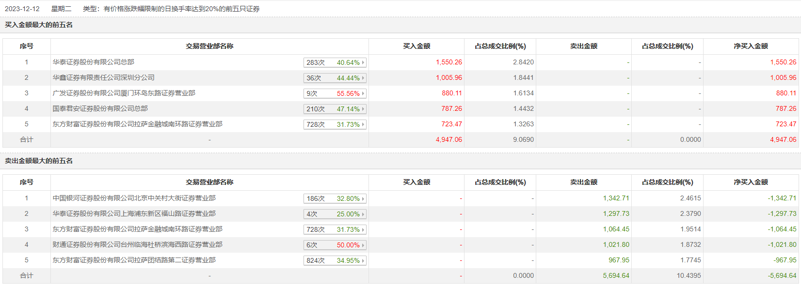 12月12日,一鸣食品今日涨停,全天换手率达55.41%,振幅达11.3%。龙虎榜数据显示,营业部席位合计净卖出747.58万元。其中,华泰证券总部、华鑫证券深圳分公司分别买入1550.26万元、1005.96万元;中国银河证券北京中关村大街证券营业部、华泰证券上海浦东新区福山路证券营业部分别卖出1342.71万元、1297.73万元。
