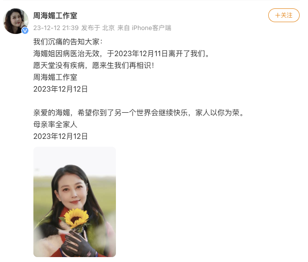12月12日晚,微博@周海媚工作室发文确认周海媚离世。文中称,“海媚姐因病医治无效,于2023年12月11日离开了我们。愿天堂没有疾病,愿来生我们再相识!”周海媚母亲率全家人表示:“希望你到了另一个世界会继续快乐,家人以你为荣。”