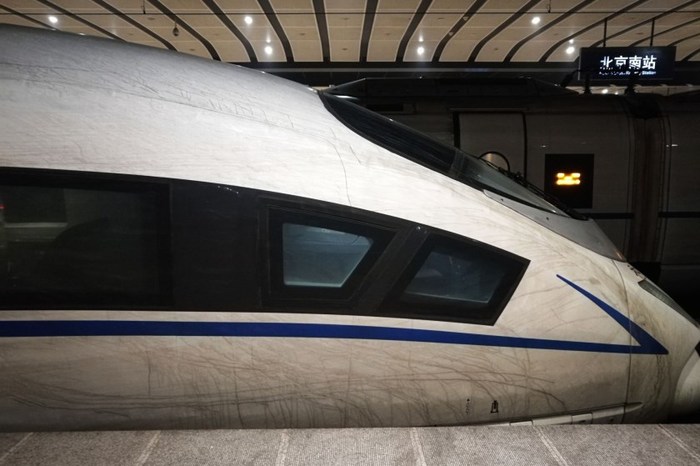1. 2017年1月2日,北京南站,刚从上海到达北京5个多小时穿行800多公里的高铁。这辆穿越了华东、华北全部重雾霾区的高铁未经沿途雨水冲刷,尘埃布满整个车身。据悉,高铁在时速超过200至300公里时,列车交错时会产生空气压,空气压产生的强大气流将空气中的细小颗粒物紧贴到高铁车身,使洁白光滑的高铁车身布满尘埃。