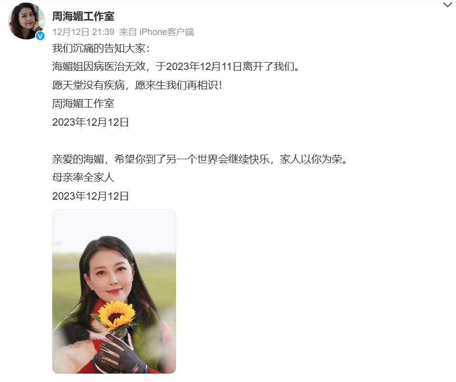 12月12日晚,周海媚工作室发布讣告,周海媚因病离世。