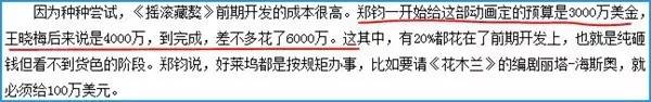该片一开始由郑钧自己的公司漫动时空运作,做着做着资金链出了问题。“最紧张的时候,团队坚持过八个月不发薪水干活,包括美国的团队。”后来,华谊接手,加上时代天骄的投资,又得以继续。但到后期,资金又出问题。“当初签约的那家制作公司答应投一笔钱才成为合作伙伴,但因为自家上映电影,突然没钱退出。”煎熬了半年,最后华谊又追加了投资。