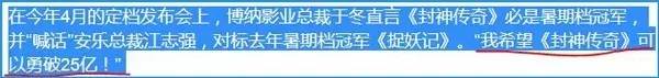 博纳老总于冬曾豪言希望《封神传奇》票房破25亿。