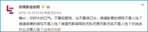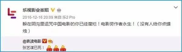 因为电影上映时遭遇差评,张艺谋签约公司乐视影业的总裁张昭微博对阵影评人,乐视官方还给“亵渎电影”发去了警告函。