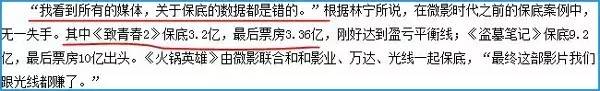 但微影时代老总林宁在接受采访时说,所有媒体报道的关于保底的数据都是错的。比如微影保底的《致青春2》和《盗墓笔记》就没亏。