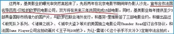 上海有一家叫基美影业的公司,2008年成立,做了不少买断批片的引进发行,比如《名侦探柯南2009》、《女巫季节》、《危情三日》、《人狼大战》、《在劫难逃》、《逆世界》、《乔布斯》、《精灵旅社》、《别惹我》、《美国骗局》、《暴力街区》、《超体》,不少都赚钱。后来,这家公司转向制片,和法国名导吕克-贝松的欧罗巴公司建了了合作关系,前两年参与投资的《飓风营救3》(2.04亿)、《玩命速递4》(1.28亿)票房都还不错。